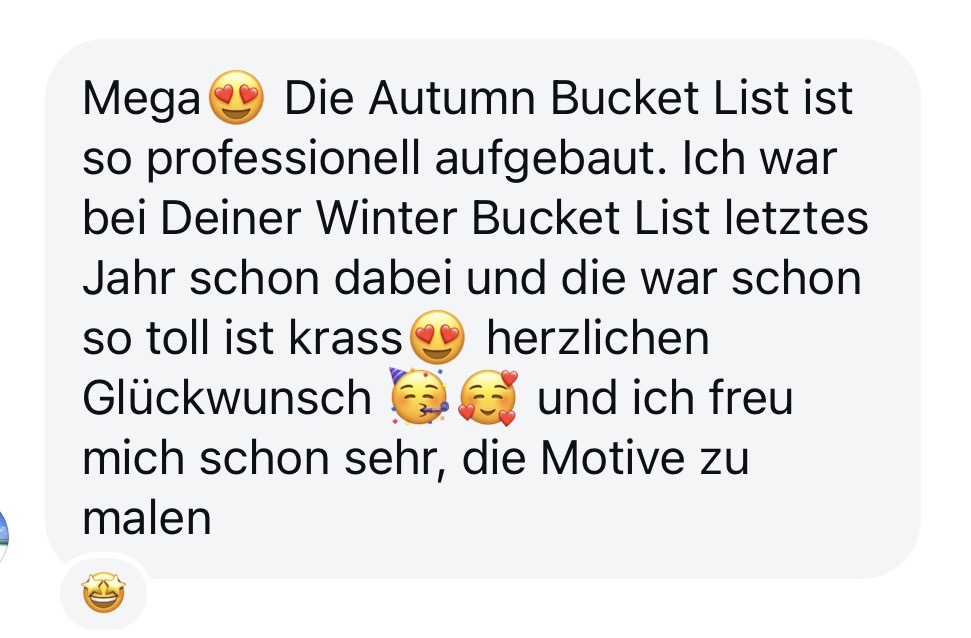 „Ich habe mir am Wochenende die Winter Bucket List geholt und finde sie wirklich Klasse. Es ist so cool, einen Onlinekurs zu haben, der nicht mit einem Motiv „aufgebraucht“ ist.“