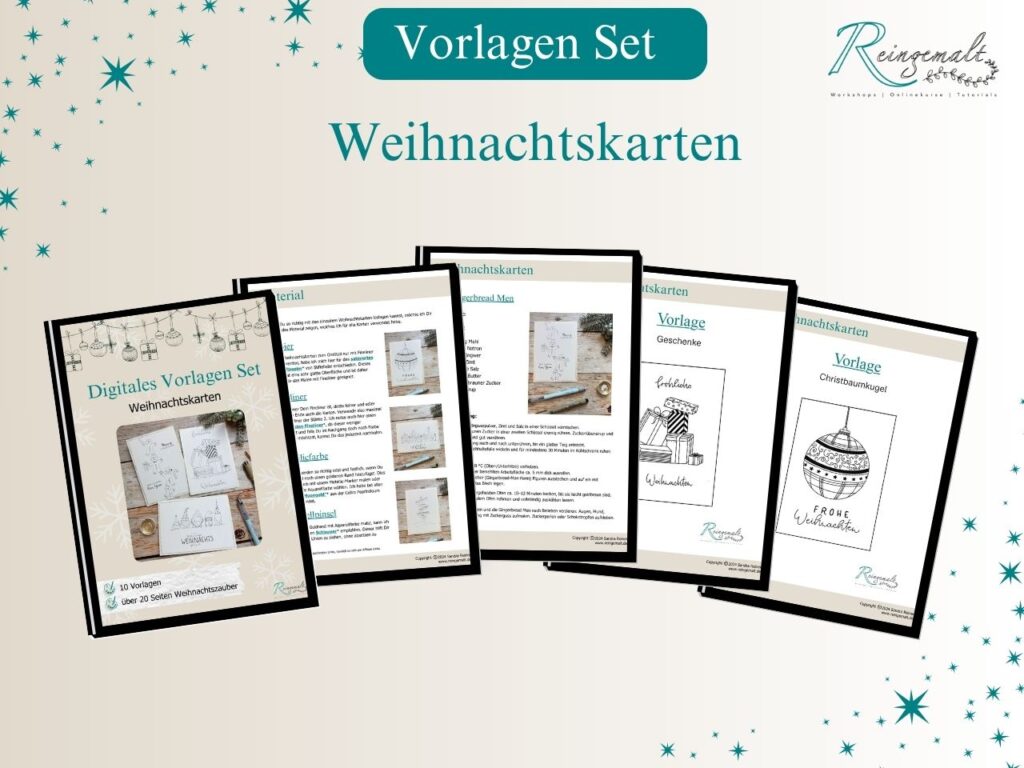 Mit dem Weihnachtskarten Vorlagen Set musst Du nicht mehr ratlos vor einem leeren Kartenrohling sitzen, sondern hast wunderschöne Motive als Grundlage, die Du mit Aquarell, Gouache, Buntstiften oder Finelinern ganz individuell ausgestalten kannst.