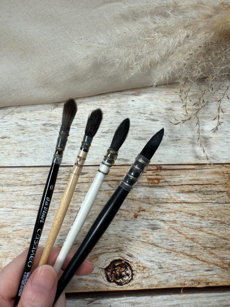 Ein Verwaschpinsel in Größe 1 oder 2 (je nach Hersteller) deckt für Anfänger:innen die meisten Anwendungen sehr gut ab. Ich persönlich nutze am häufigsten den Verwaschpinsel von DaVinci Casaneo* (spare mit bei den Gustavsons mit dem Code “Reingemalt5 5% auf deine Bestellung” oder von Kum den French Aqua*